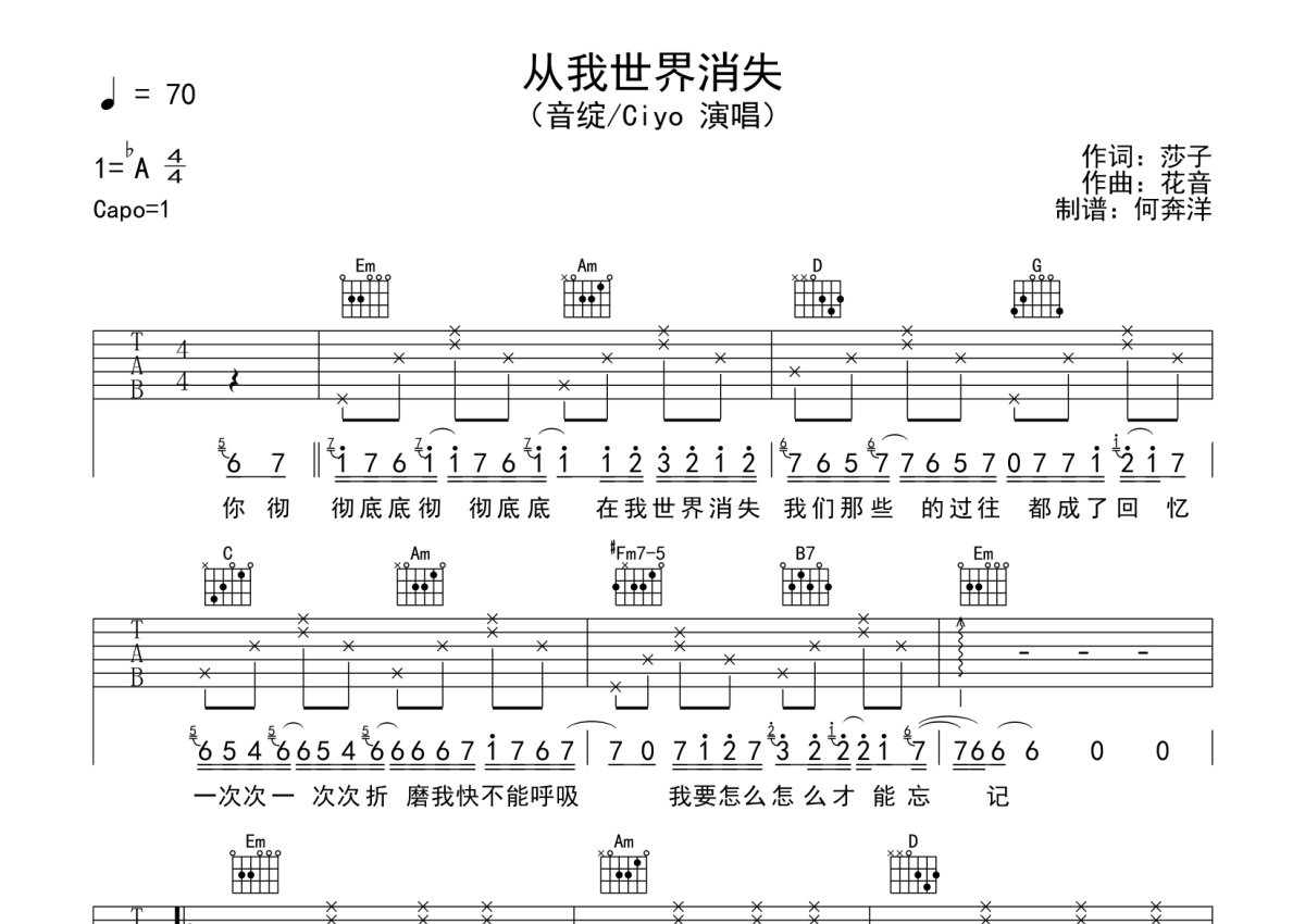音绽/Ciyo《从我世界消失》吉他谱 - G调弹唱六线谱