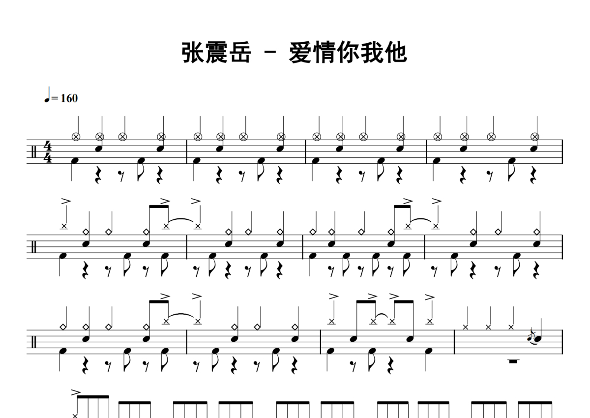 《爱情你我他》是张震岳演唱的一首歌曲,拍号为4/4拍,歌曲速度为每分钟160拍,这份鼓谱共有四张高清图谱,图谱由 @老虎不说谎 编配上传,图谱使用五线谱编配,使用这份爱情你我他架子鼓谱,你将能够轻松地敲打出这首张震岳的爱情你我他,快来尝试吧。
