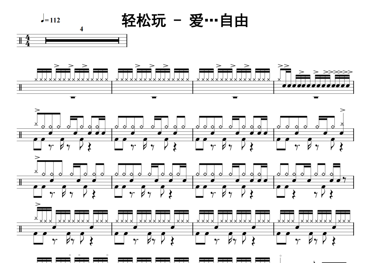 《爱…自由》是轻松玩演唱的一首歌曲,拍号为4/4拍,歌曲速度为每分钟112拍,这份鼓谱共有三张高清图谱,图谱由 @老虎不说谎 编配上传,图谱使用五线谱编配,使用这份爱…自由架子鼓谱,你将能够轻松地敲打出这首轻松玩的爱…自由,快来尝试吧。