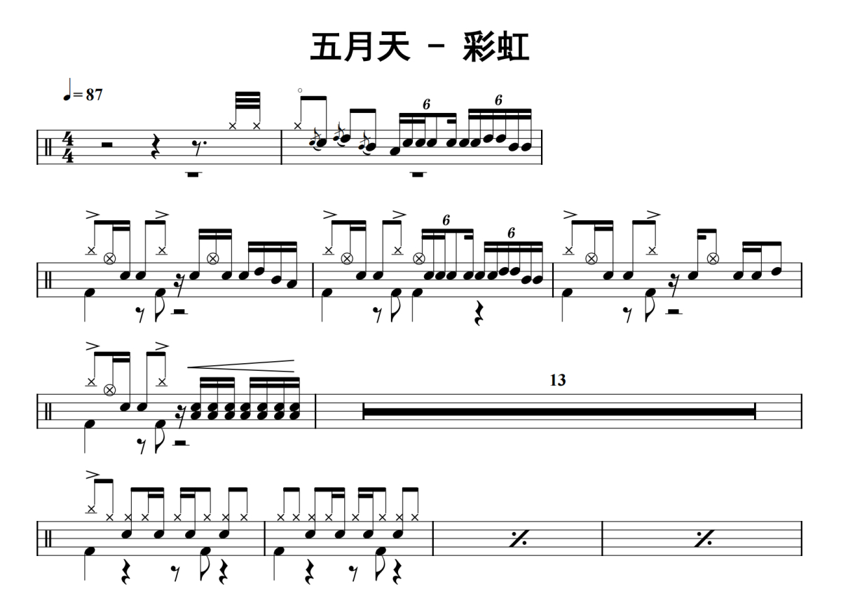 《彩虹》是五月天演唱的一首歌曲,拍号为4/4拍,歌曲速度为每分钟87拍,这份鼓谱共有三张高清图谱,图谱由 @老虎不说谎 编配上传,图谱使用五线谱编配,使用这份彩虹架子鼓谱,你将能够轻松地敲打出这首五月天的彩虹,快来尝试吧。