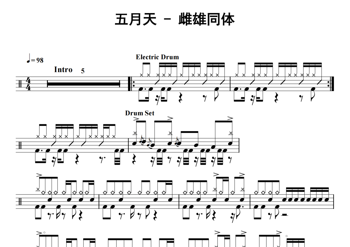 《雌雄同体》是五月天演唱的一首歌曲,拍号为4/4拍,歌曲速度为每分钟98拍,这份鼓谱共有四张高清图谱,图谱由 @老虎不说谎 编配上传,图谱使用五线谱编配,使用这份雌雄同体架子鼓谱,你将能够轻松地敲打出这首五月天的雌雄同体,快来尝试吧。