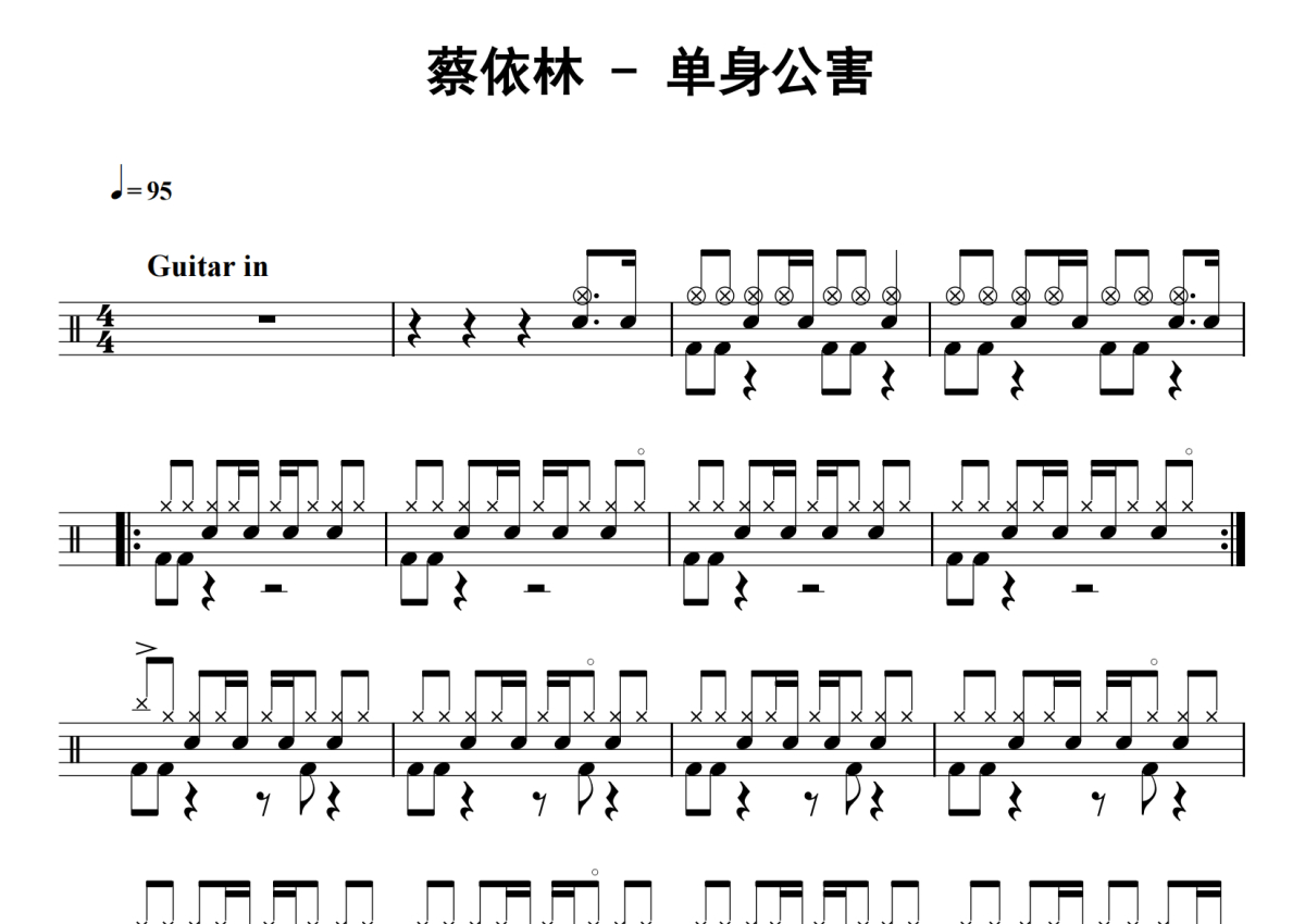 《单身公害》是蔡依林演唱的一首歌曲,拍号为4/4拍,歌曲速度为每分钟95拍,这份鼓谱共有三张高清图谱,图谱由 @老虎不说谎 编配上传,图谱使用五线谱编配,使用这份单身公害架子鼓谱,你将能够轻松地敲打出这首蔡依林的单身公害,快来尝试吧。