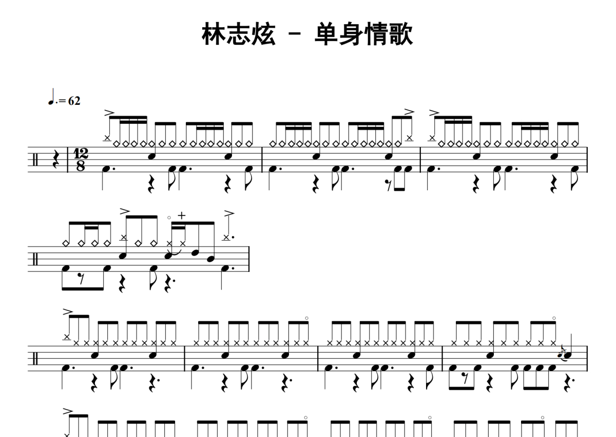 《单身情歌》是林志炫演唱的一首歌曲,歌曲速度为每分钟62拍,这份鼓谱共有三张高清图谱,图谱由 @老虎不说谎 编配上传,图谱使用五线谱编配,使用这份单身情歌架子鼓谱,你将能够轻松地敲打出这首林志炫的单身情歌,快来尝试吧。12/8。