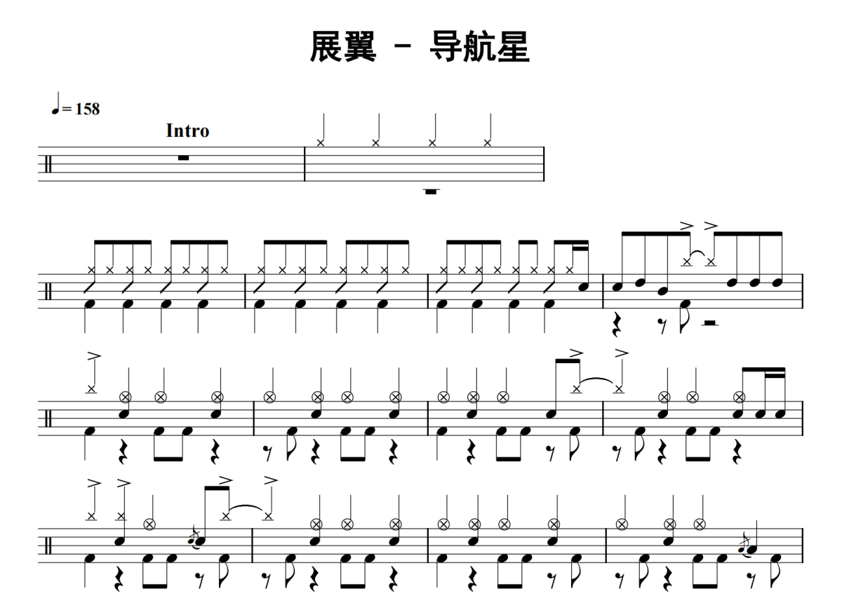 《导航星》是展翼演唱的一首歌曲,拍号为4/4拍,歌曲速度为每分钟158拍,这份鼓谱共有四张高清图谱,图谱由 @老虎不说谎 编配上传,图谱使用五线谱编配,使用这份导航星架子鼓谱,你将能够轻松地敲打出这首展翼的导航星,快来尝试吧。