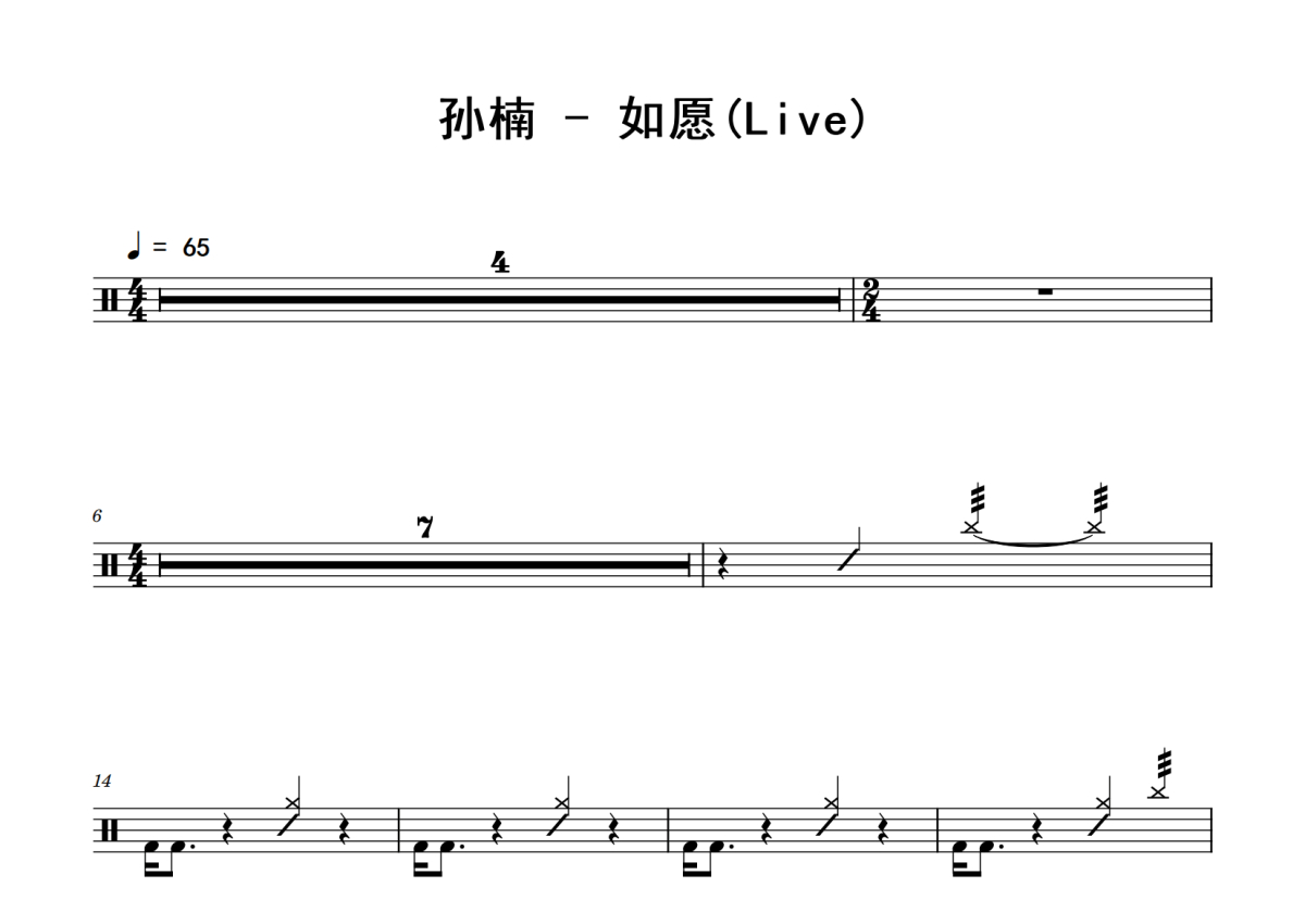 《如愿》是孙楠演唱的一首歌曲,(Live),拍号为4/4拍,歌曲速度为每分钟65拍,这份鼓谱共有两张高清图谱,图谱由 @老虎不说谎 编配上传,图谱使用五线谱编配,使用这份如愿架子鼓谱,你将能够轻松地敲打出这首孙楠的如愿,快来尝试吧。