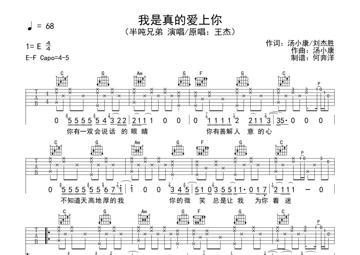 半吨兄弟《我是真的爱上你》吉他谱 - C调弹唱六线谱