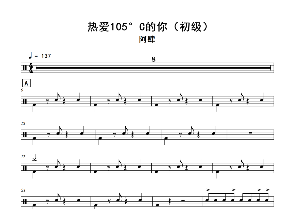 阿肆《热爱105°C的你》鼓谱 - 架子鼓谱 - (初级)