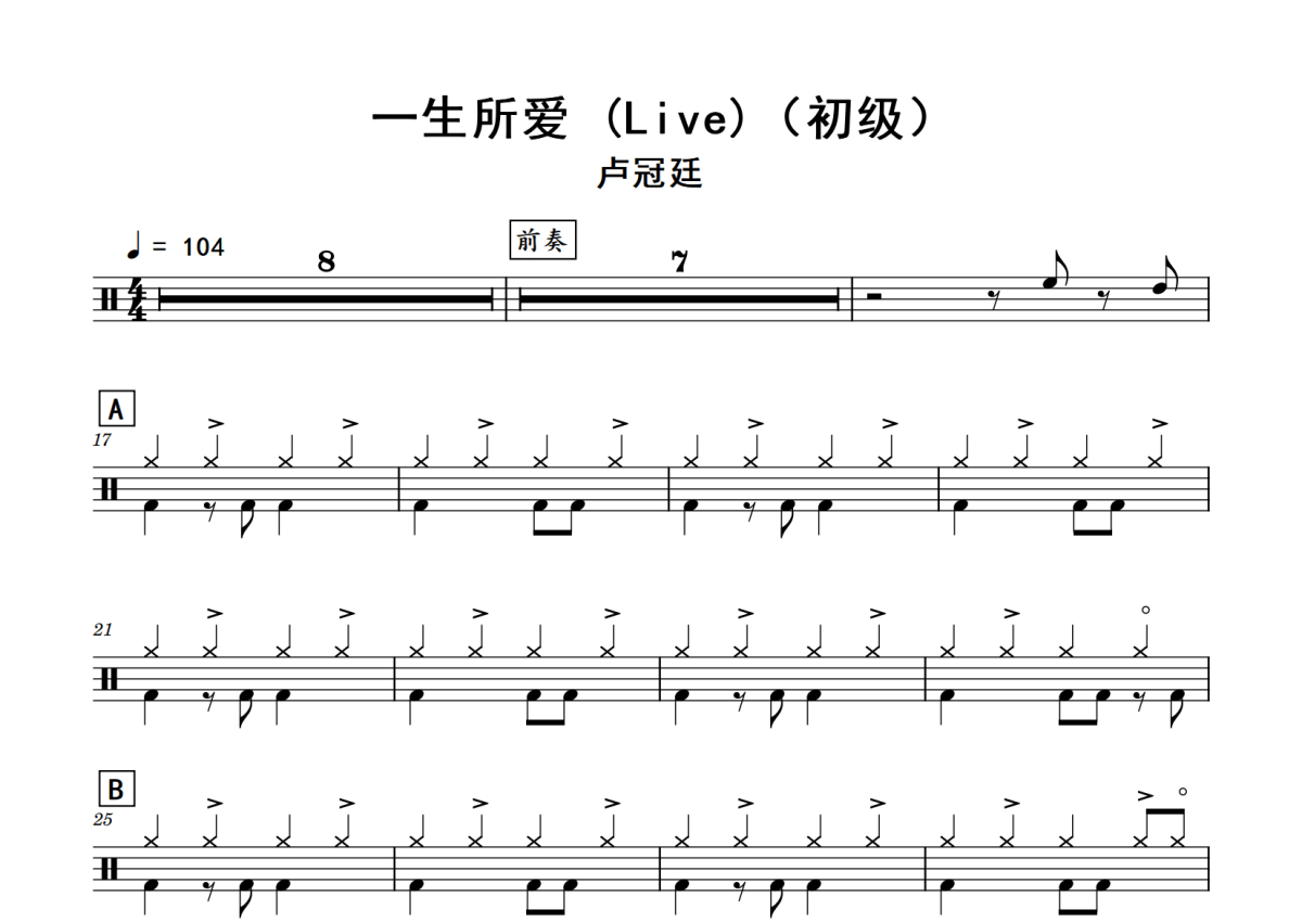 卢冠廷《一生所爱》鼓谱 - 架子鼓谱 - 初级_(Live)