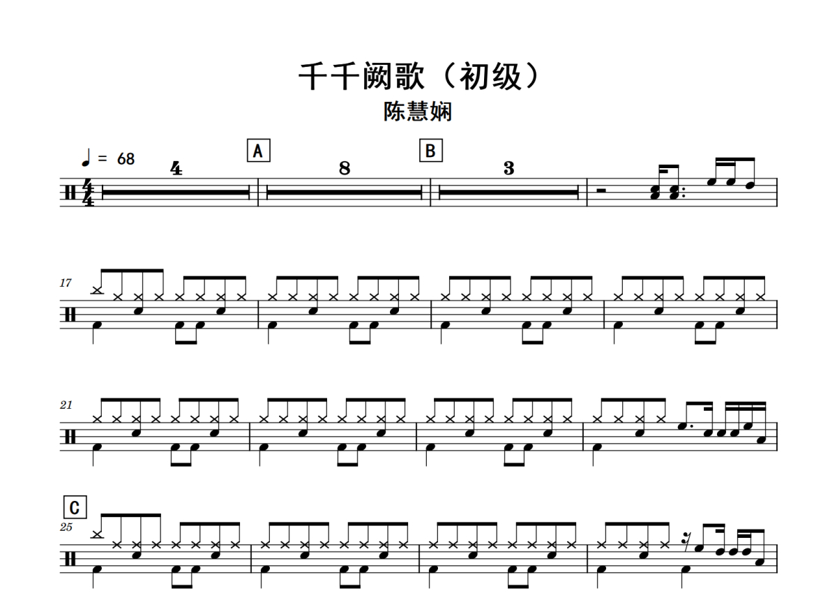《千千阙歌》是陈慧娴演唱的一首歌曲,初级,拍号为4/4拍,歌曲速度为每分钟68拍,这份鼓谱共有两张高清图谱,图谱由 @老虎不说谎 编配上传,图谱使用五线谱编配,使用这份千千阙歌架子鼓谱,你将能够轻松地敲打出这首陈慧娴的千千阙歌,快来尝试吧。