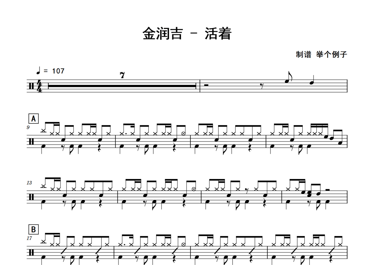 《活着》是金润吉演唱的一首歌曲,拍号为4/4拍,歌曲速度为每分钟107拍,这份鼓谱共有两张高清图谱,图谱由 @老虎不说谎 编配上传,图谱使用五线谱编配,使用这份活着架子鼓谱,你将能够轻松地敲打出这首金润吉的活着,快来尝试吧。