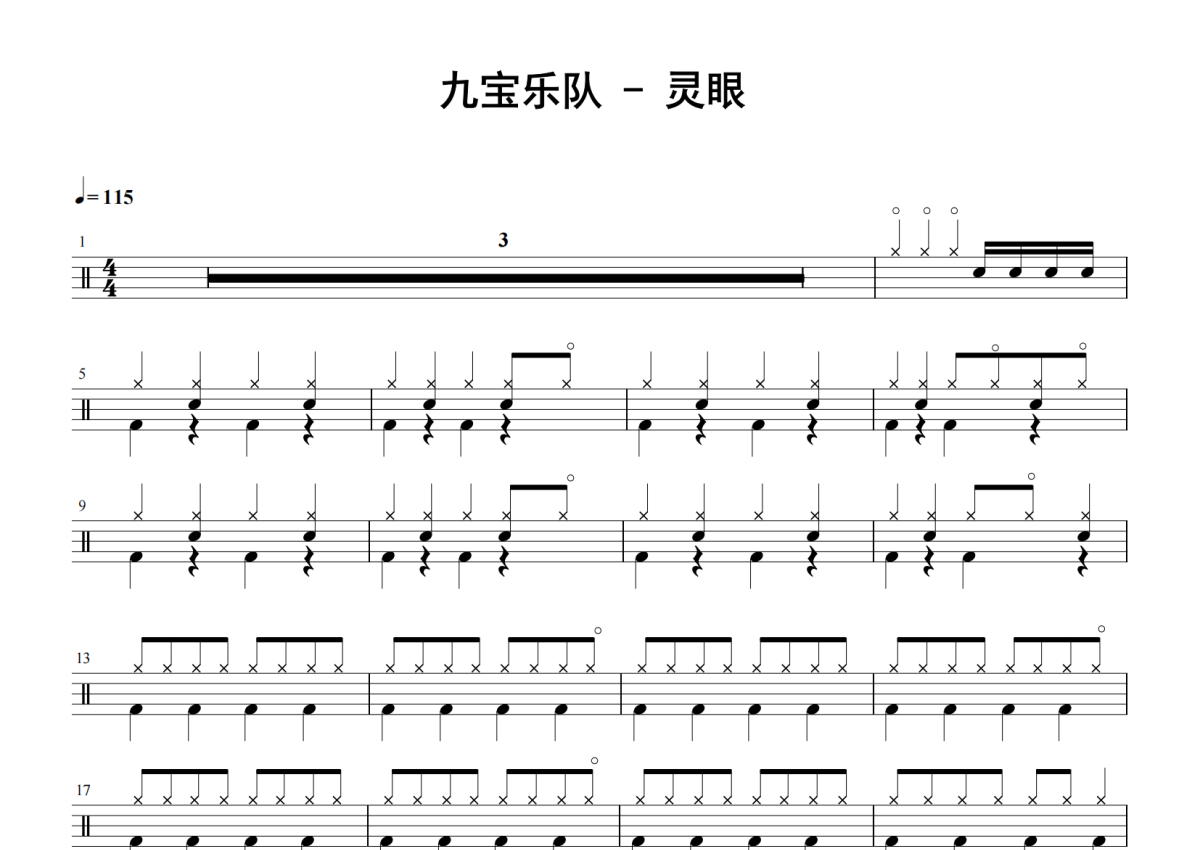《灵眼》是九宝乐队演唱的一首歌曲,拍号为4/4拍,歌曲速度为每分钟115拍,这份鼓谱共有三张高清图谱,图谱由 @老虎不说谎 编配上传,图谱使用五线谱编配,使用这份灵眼架子鼓谱,你将能够轻松地敲打出这首九宝乐队的灵眼,快来尝试吧。