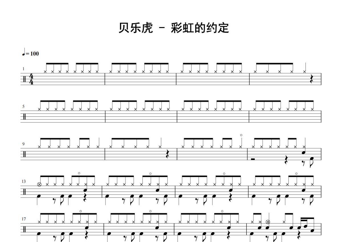 《彩虹的约定》是贝乐虎演唱的一首歌曲,拍号为4/4拍,歌曲速度为每分钟100拍,这份鼓谱共有三张高清图谱,图谱由 @老虎不说谎 编配上传,图谱使用五线谱编配,使用这份彩虹的约定架子鼓谱,你将能够轻松地敲打出这首贝乐虎的彩虹的约定,快来尝试吧。