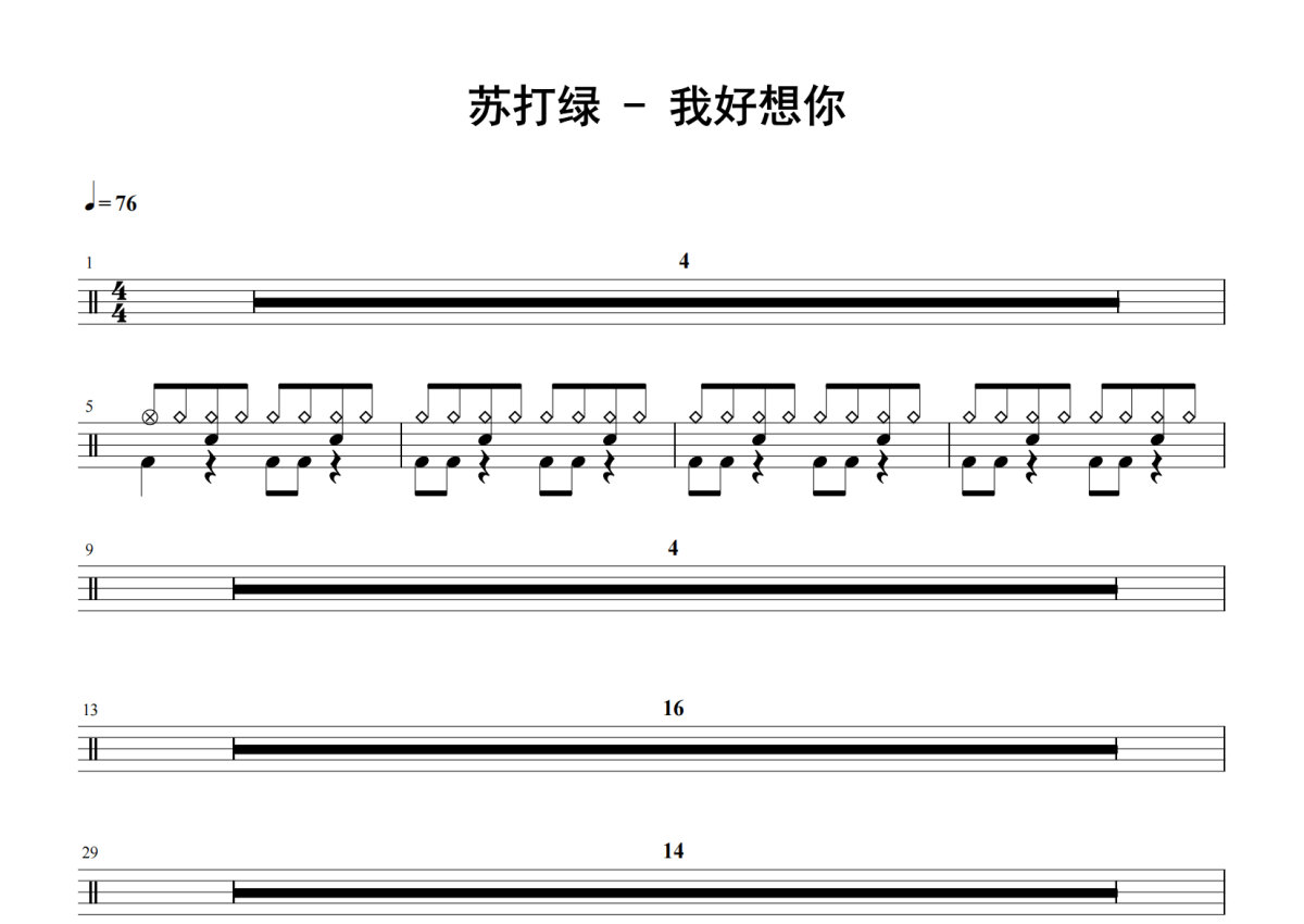 《我好想你》是苏打绿演唱的一首歌曲,拍号为4/4拍,歌曲速度为每分钟76拍,这份鼓谱共有两张高清图谱,图谱由 @老虎不说谎 编配上传,图谱使用五线谱编配,使用这份我好想你架子鼓谱,你将能够轻松地敲打出这首苏打绿的我好想你,快来尝试吧。