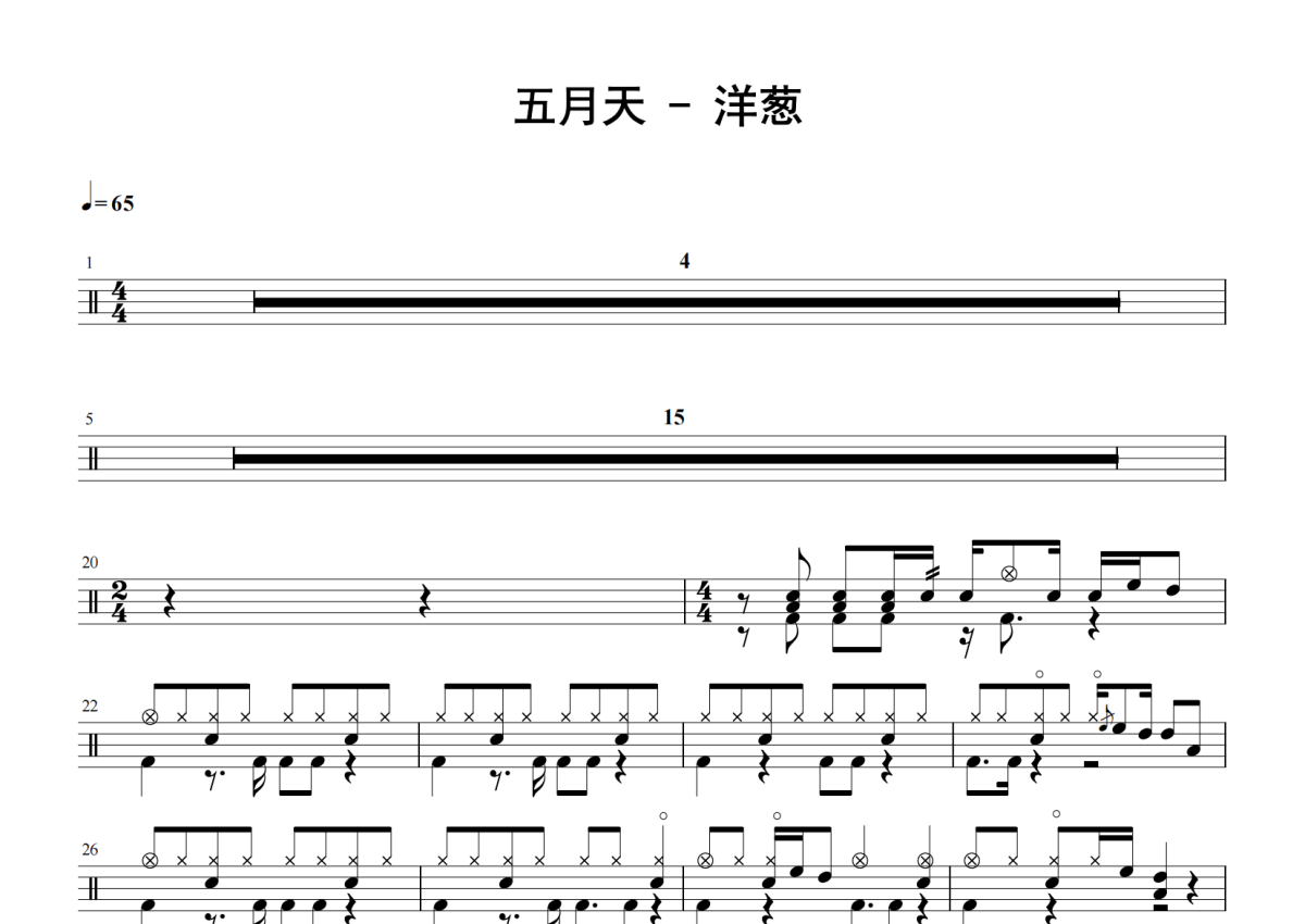 《洋葱》是五月天乐队演唱的一首歌曲,拍号为4/4拍,歌曲速度为每分钟65拍,这份鼓谱共有两张高清图谱,图谱由 @老虎不说谎 编配上传,图谱使用五线谱编配,使用这份洋葱架子鼓谱,你将能够轻松地敲打出这首五月天乐队的洋葱,快来尝试吧。