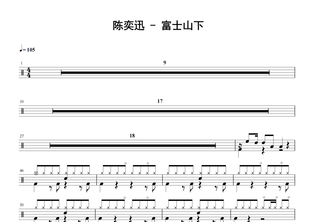 《富士山下》是陈奕迅演唱的一首歌曲,拍号为4/4拍,歌曲速度为每分钟105拍,这份鼓谱共有两张高清图谱,图谱由 @老虎不说谎 编配上传,图谱使用五线谱编配,使用这份富士山下架子鼓谱,你将能够轻松地敲打出这首陈奕迅的富士山下,快来尝试吧。