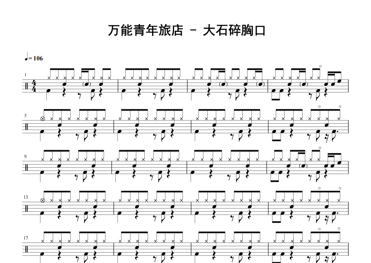 《大石碎胸口》是万能青年旅店演唱的一首歌曲,拍号为4/4拍,歌曲速度为每分钟106拍,这份鼓谱共有四张高清图谱,图谱由 @老虎不说谎 编配上传,图谱使用五线谱编配,使用这份大石碎胸口架子鼓谱,你将能够轻松地敲打出这首万能青年旅店的大石碎胸口,快来尝试吧。