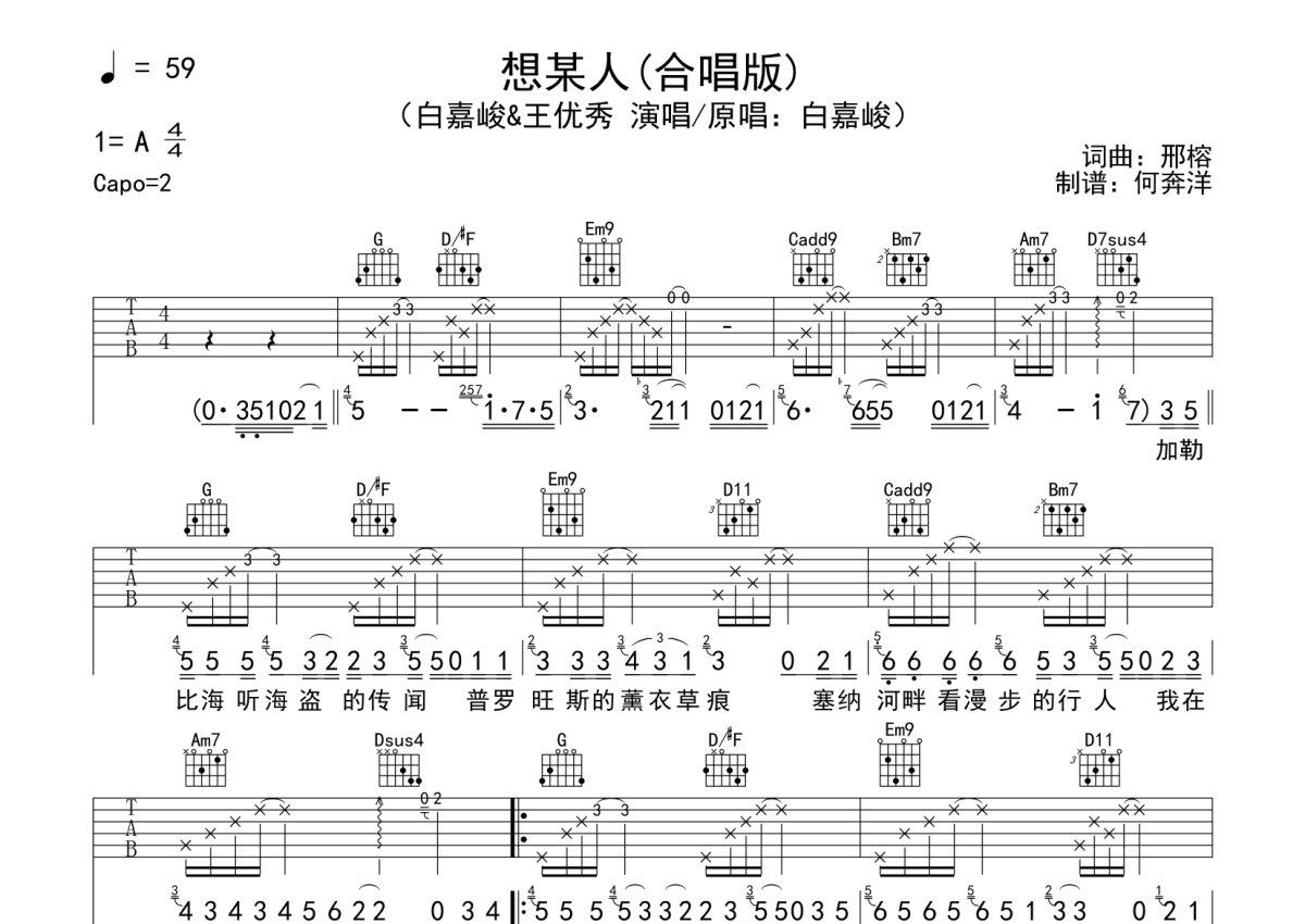《想某人》是白嘉峻/王优秀演唱的一首歌曲,合唱版,本吉他谱采用的是G调指法编配,这份吉他谱共有两张高清图谱,图谱由 @何奔洋 编配上传,图谱使用六线谱编配,包含吉他和弦指法、简谱以及歌词部分,曲谱配备了相关的音频提供试听,使用这份想某人吉他谱,可以让你更加方便地掌握这首歌曲的弹唱技巧,快来尝试吧。白嘉峻/王优秀《想某人》吉他谱_G调吉他弹唱谱_合唱版。