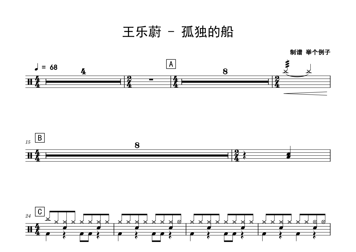 《孤独的船》是王乐蔚演唱的一首歌曲,拍号为4/4拍,歌曲速度为每分钟68拍,这份鼓谱共有两张高清图谱,图谱由 @老虎不说谎 编配上传,图谱使用五线谱编配,使用这份孤独的船架子鼓谱,你将能够轻松地敲打出这首王乐蔚的孤独的船,快来尝试吧。