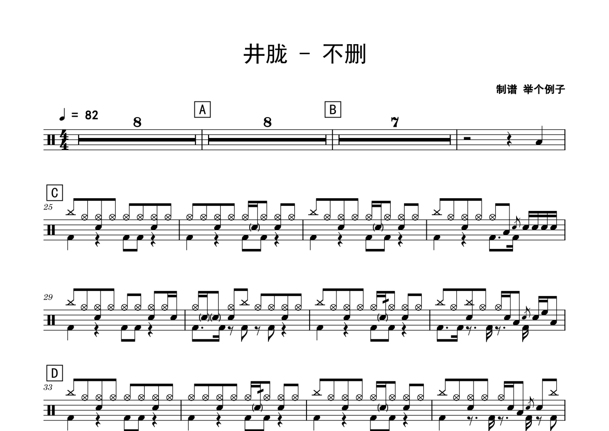 《不删》是井胧演唱的一首歌曲,拍号为4/4拍,歌曲速度为每分钟82拍,这份鼓谱共有两张高清图谱,图谱由 @老虎不说谎 编配上传,图谱使用五线谱编配,使用这份不删架子鼓谱,你将能够轻松地敲打出这首井胧的不删,快来尝试吧。
