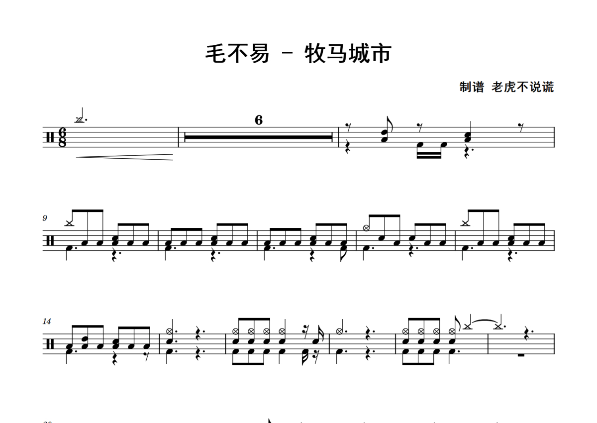 《牧马城市》是毛不易演唱的一首歌曲,拍号为6/8拍,这份鼓谱共有四张高清图谱,图谱由 @老虎不说谎 编配上传,图谱使用五线谱编配,使用这份牧马城市架子鼓谱,你将能够轻松地敲打出这首毛不易的牧马城市,快来尝试吧。