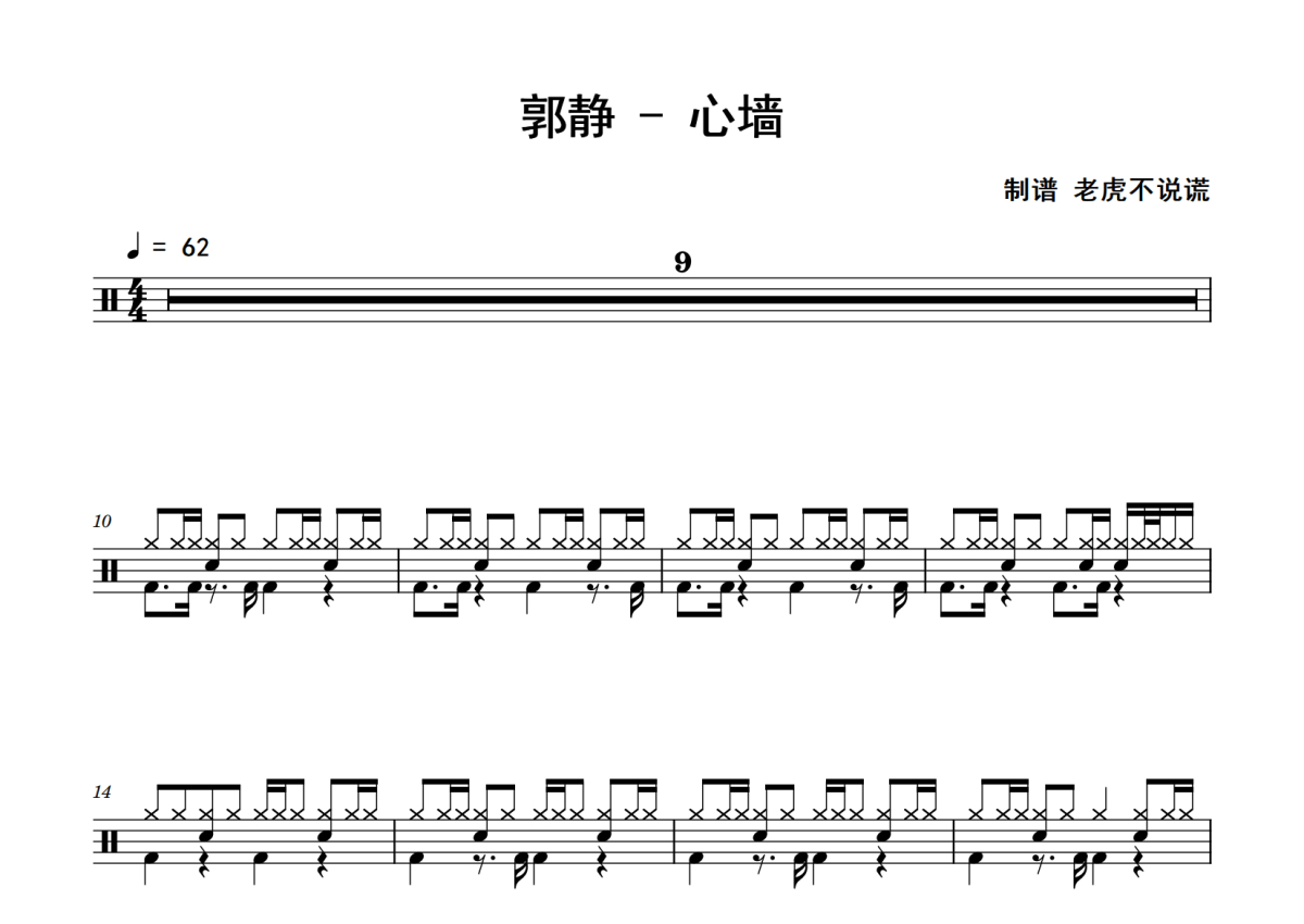 《心墙》是郭静演唱的一首歌曲,拍号为4/4拍,歌曲速度为每分钟62拍,这份鼓谱共有两张高清图谱,图谱由 @老虎不说谎 编配上传,图谱使用五线谱编配,使用这份心墙架子鼓谱,你将能够轻松地敲打出这首郭静的心墙,快来尝试吧。