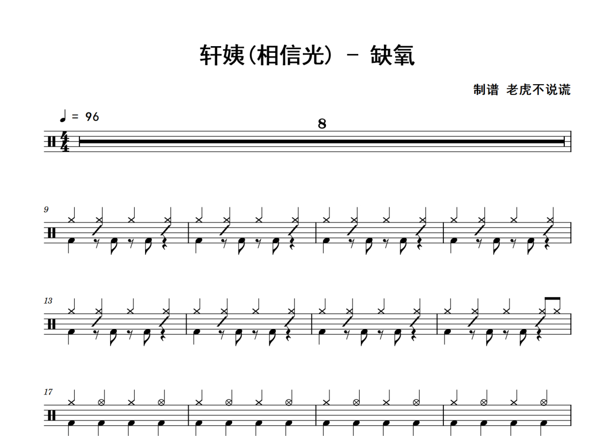 《缺氧》是轩姨(相信光)演唱的一首歌曲,拍号为4/4拍,歌曲速度为每分钟96拍,这份鼓谱共有三张高清图谱,图谱由 @老虎不说谎 编配上传,图谱使用五线谱编配,使用这份缺氧架子鼓谱,你将能够轻松地敲打出这首轩姨(相信光)的缺氧,快来尝试吧。