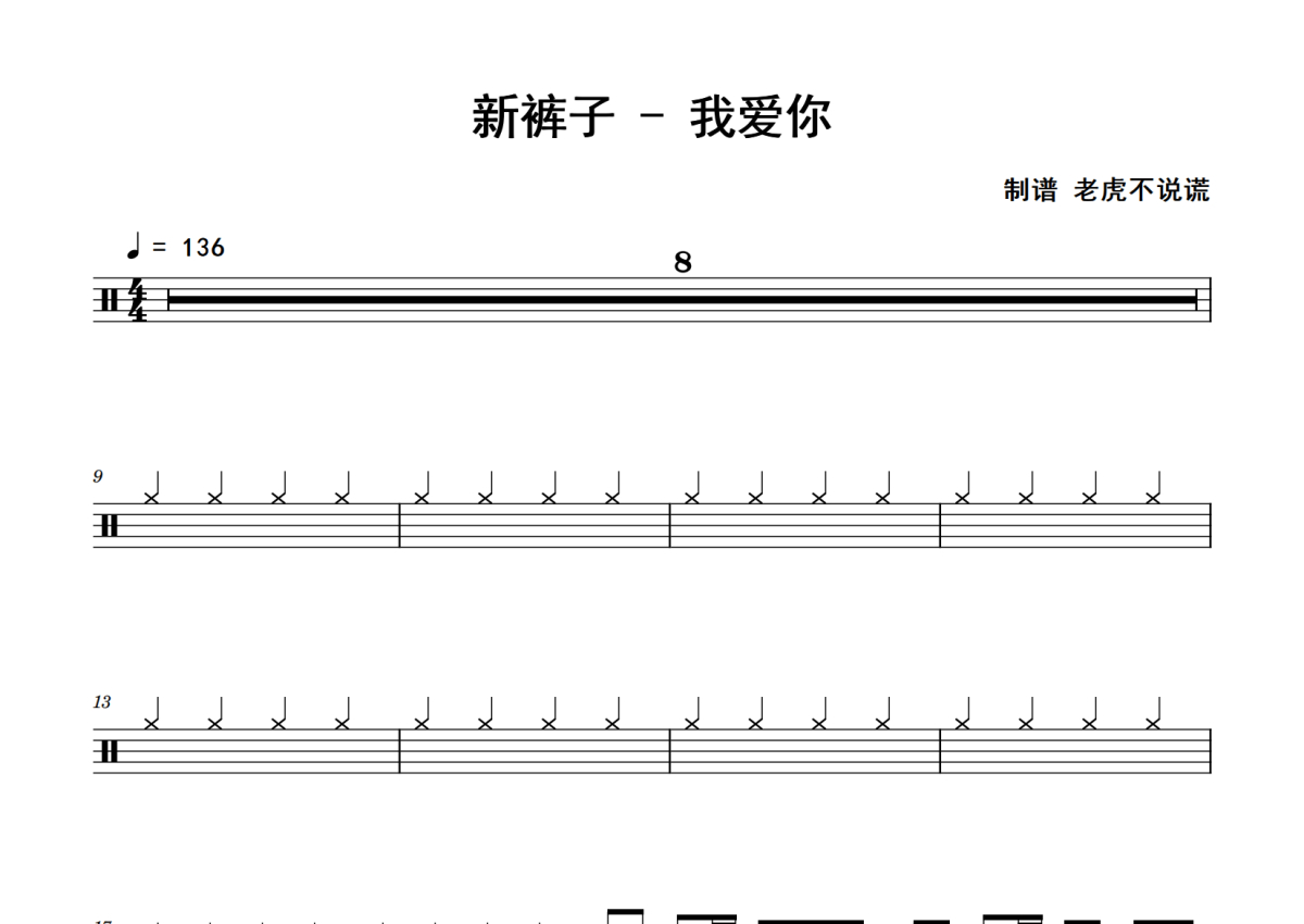 《我爱你》是新裤子演唱的一首歌曲,拍号为4/4拍,歌曲速度为每分钟136拍,这份鼓谱共有四张高清图谱,图谱由 @老虎不说谎 编配上传,图谱使用五线谱编配,使用这份我爱你架子鼓谱,你将能够轻松地敲打出这首新裤子的我爱你,快来尝试吧。