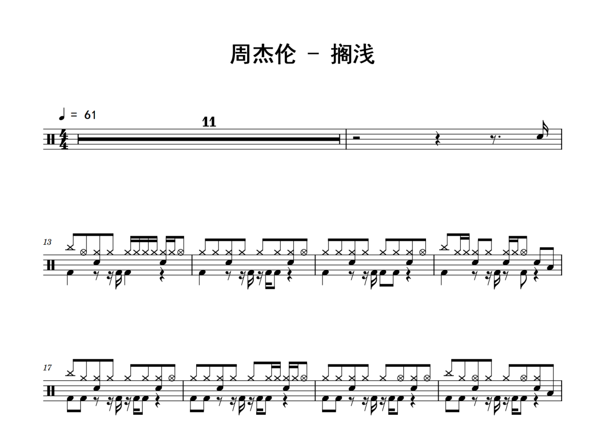 《搁浅》是周杰伦演唱的一首歌曲,拍号为4/4拍,歌曲速度为每分钟61拍,这份鼓谱共有两张高清图谱,图谱由 @老虎不说谎 编配上传,图谱使用五线谱编配,使用这份搁浅架子鼓谱,你将能够轻松地敲打出这首周杰伦的搁浅,快来尝试吧。