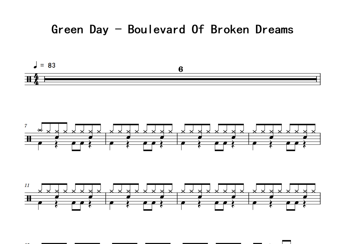 《Boulevard Of Broken Dreams》是Green Day演唱的一首歌曲,拍号为4/4拍,歌曲速度为每分钟83拍,这份鼓谱共有三张高清图谱,图谱由 @老虎不说谎 编配上传,图谱使用五线谱编配,使用这份Boulevard Of Broken Dreams架子鼓谱,你将能够轻松地敲打出这首Green Day的Boulevard Of Broken Dreams,快来尝试吧。