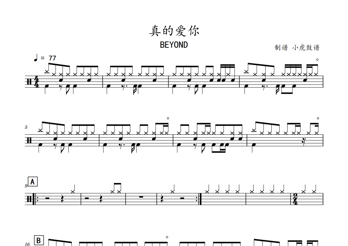 《真的爱你》是Beyond演唱的一首歌曲,拍号为4/4拍,歌曲速度为每分钟77拍,这份鼓谱共有三张高清图谱,图谱由 @老虎不说谎 编配上传,图谱使用五线谱编配,使用这份真的爱你架子鼓谱,你将能够轻松地敲打出这首Beyond的真的爱你,快来尝试吧。