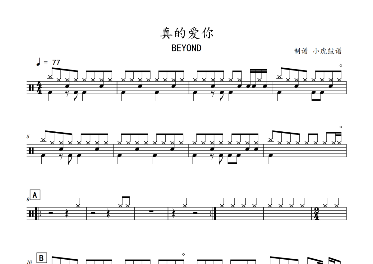 《真的爱你》是Beyond演唱的一首歌曲,(初级),拍号为4/4拍,歌曲速度为每分钟77拍,这份鼓谱共有三张高清图谱,图谱由 @老虎不说谎 编配上传,图谱使用五线谱编配,使用这份真的爱你架子鼓谱,你将能够轻松地敲打出这首Beyond的真的爱你,快来尝试吧。