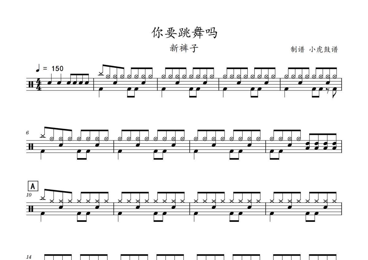 《你要跳舞吗》是新裤子乐队演唱的一首歌曲,拍号为4/4拍,歌曲速度为每分钟150拍,这份鼓谱共有三张高清图谱,图谱由 @老虎不说谎 编配上传,图谱使用五线谱编配,使用这份你要跳舞吗架子鼓谱,你将能够轻松地敲打出这首新裤子乐队的你要跳舞吗,快来尝试吧。