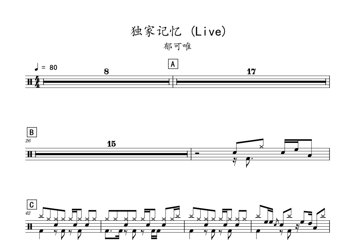 郁可唯《独家记忆》鼓谱 - 架子鼓谱 - (Live)