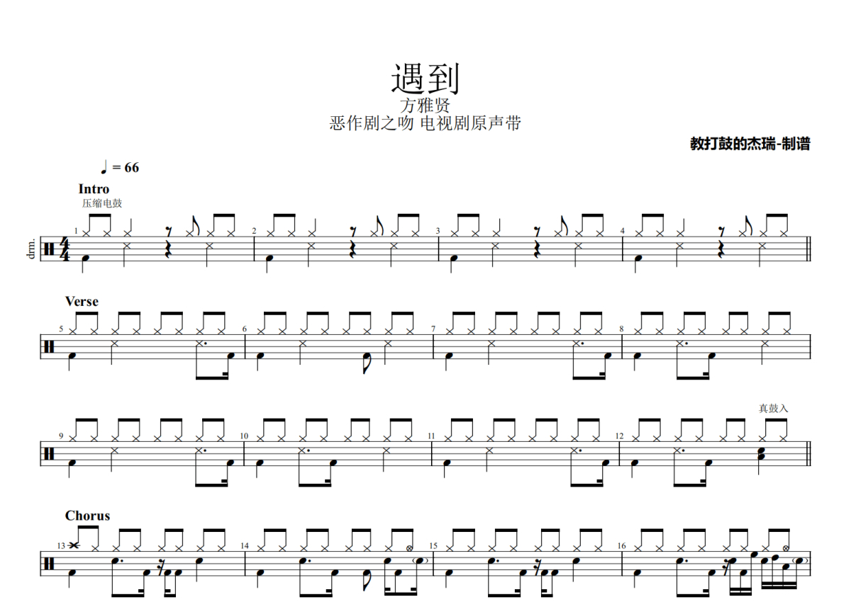 《遇到》是方雅贤演唱的一首歌曲,拍号为4/4拍,歌曲速度为每分钟66拍,这份鼓谱共有两张高清图谱,图谱由 @Jerry 编配上传,图谱使用五线谱编配,使用这份遇到架子鼓谱,你将能够轻松地敲打出这首方雅贤的遇到,快来尝试吧。