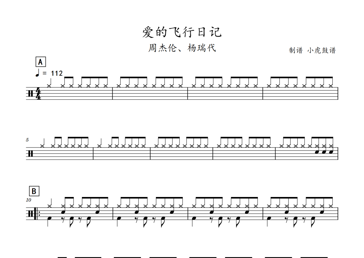 《爱的飞行日记》是周杰伦演唱的一首歌曲,拍号为4/4拍,歌曲速度为每分钟112拍,这份鼓谱共有三张高清图谱,图谱由 @老虎不说谎 编配上传,图谱使用五线谱编配,使用这份爱的飞行日记架子鼓谱,你将能够轻松地敲打出这首周杰伦的爱的飞行日记,快来尝试吧。