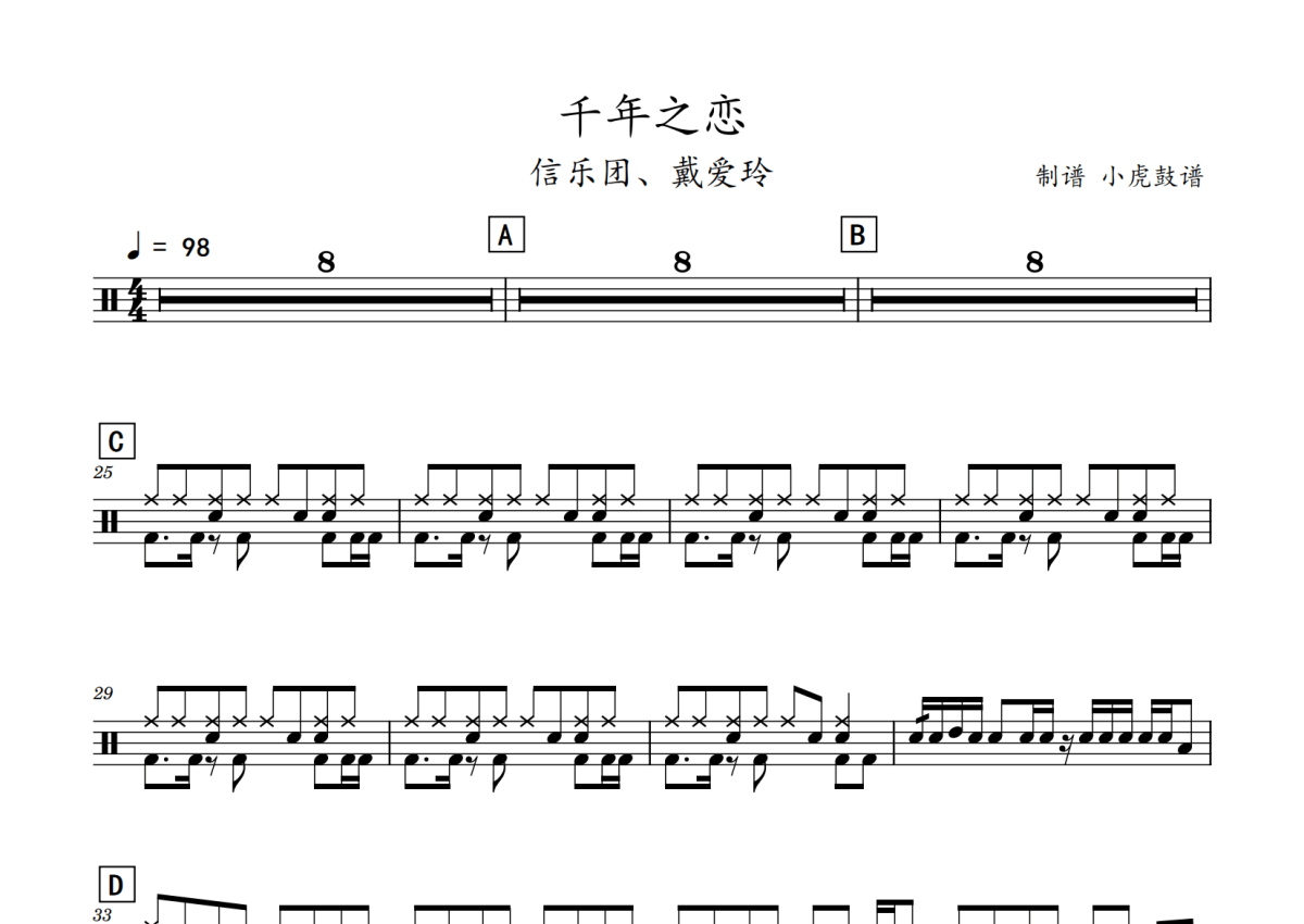 《千年之恋》是飞儿乐团演唱的一首歌曲,拍号为4/4拍,歌曲速度为每分钟98拍,这份鼓谱共有三张高清图谱,图谱由 @老虎不说谎 编配上传,图谱使用五线谱编配,使用这份千年之恋架子鼓谱,你将能够轻松地敲打出这首飞儿乐团的千年之恋,快来尝试吧。