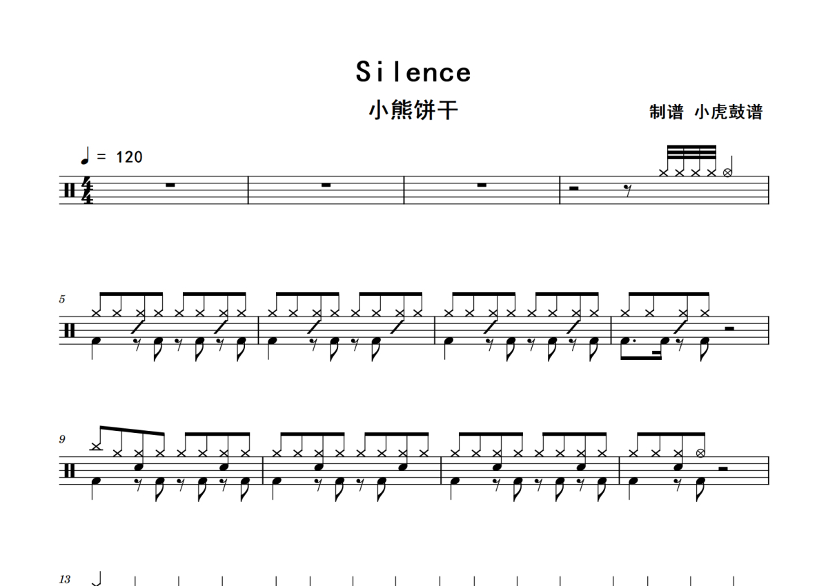 《Silence》是小熊饼干演唱的一首歌曲,拍号为4/4拍,歌曲速度为每分钟120拍,这份鼓谱共有四张高清图谱,图谱由 @老虎不说谎 编配上传,图谱使用五线谱编配,使用这份Silence架子鼓谱,你将能够轻松地敲打出这首小熊饼干的Silence,快来尝试吧。