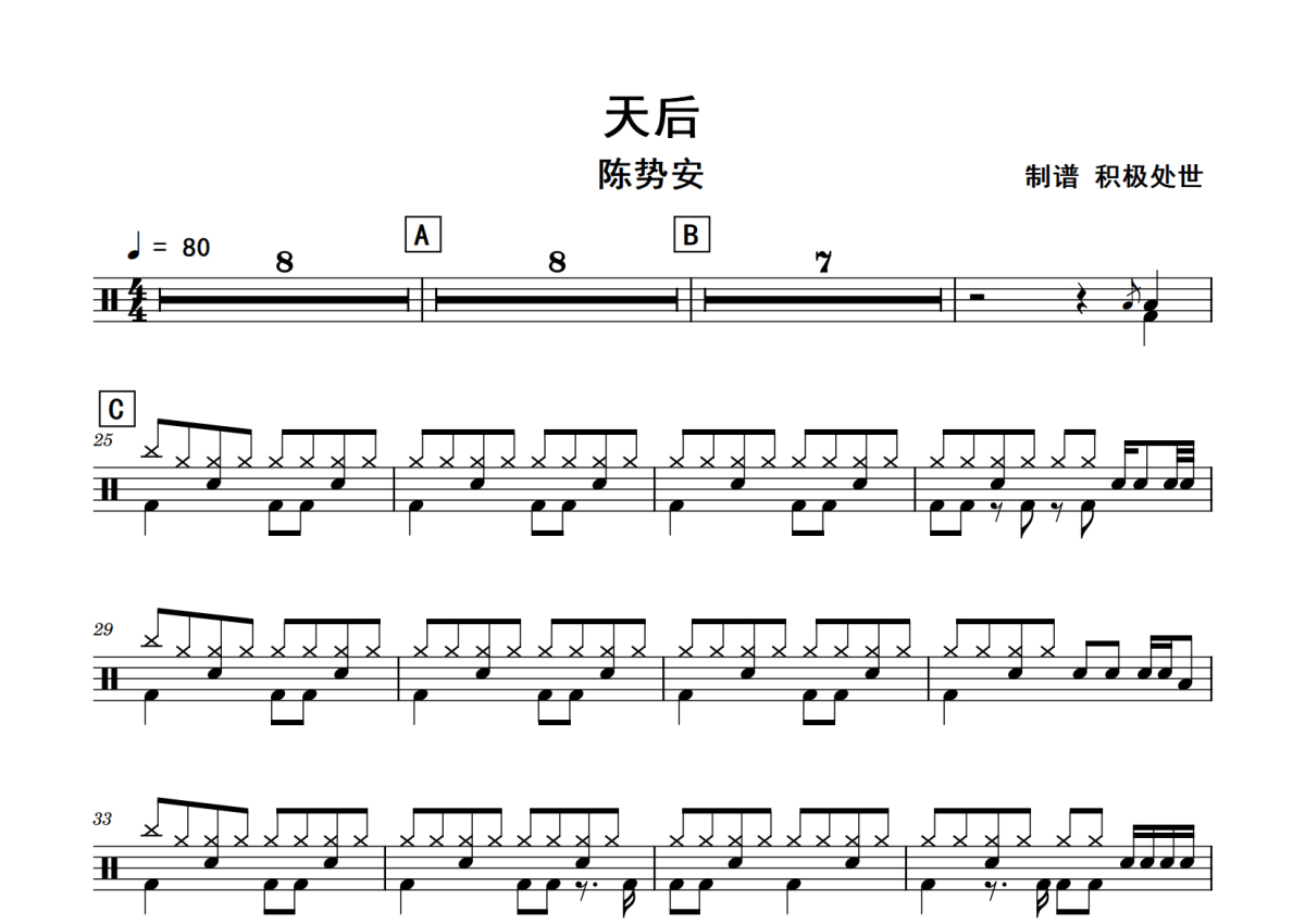 《天后》是陈势安演唱的一首歌曲,拍号为4/4拍,歌曲速度为每分钟80拍,这份鼓谱共有两张高清图谱,图谱由 @老虎不说谎 编配上传,图谱使用五线谱编配,使用这份天后架子鼓谱,你将能够轻松地敲打出这首陈势安的天后,快来尝试吧。