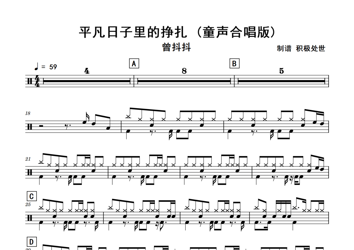 曾抖抖《平凡日子里的挣扎》鼓谱 - 架子鼓谱 - (童声合唱版)
