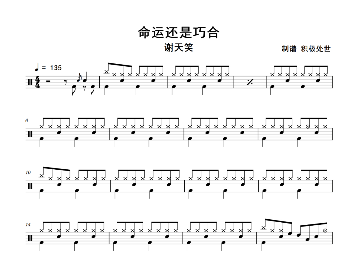 《命运还是巧合》是谢天笑演唱的一首歌曲,拍号为4/4拍,歌曲速度为每分钟135拍,这份鼓谱共有四张高清图谱,图谱由 @老虎不说谎 编配上传,图谱使用五线谱编配,使用这份命运还是巧合架子鼓谱,你将能够轻松地敲打出这首谢天笑的命运还是巧合,快来尝试吧。