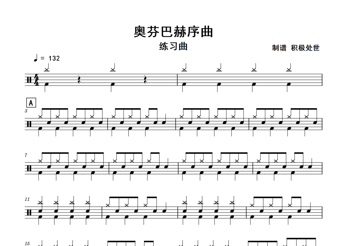 《奥芬巴赫序曲》是练习曲演唱的一首歌曲,拍号为4/4拍,歌曲速度为每分钟132拍,这份鼓谱共有两张高清图谱,图谱由 @老虎不说谎 编配上传,图谱使用五线谱编配,使用这份奥芬巴赫序曲架子鼓谱,你将能够轻松地敲打出这首练习曲的奥芬巴赫序曲,快来尝试吧。