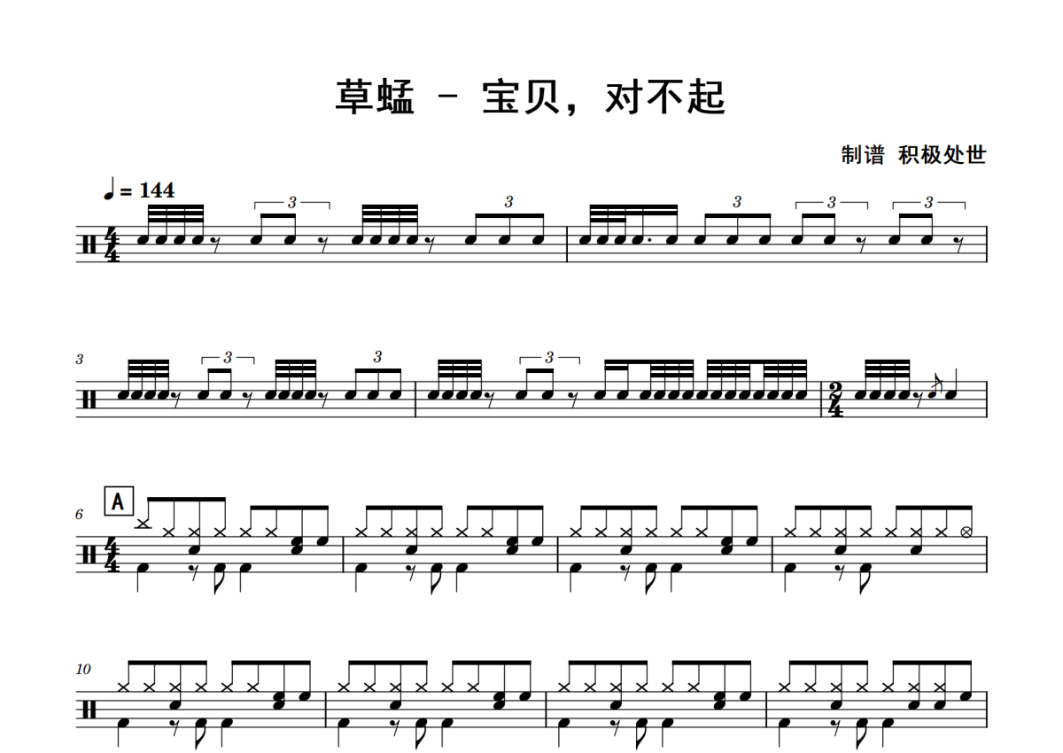 《宝贝,对不起》是草蜢演唱的一首歌曲,拍号为4/4拍,歌曲速度为每分钟144拍,这份鼓谱共有四张高清图谱,图谱由 @老虎不说谎 编配上传,图谱使用五线谱编配,使用这份宝贝,对不起架子鼓谱,你将能够轻松地敲打出这首草蜢的宝贝,对不起,快来尝试吧。
