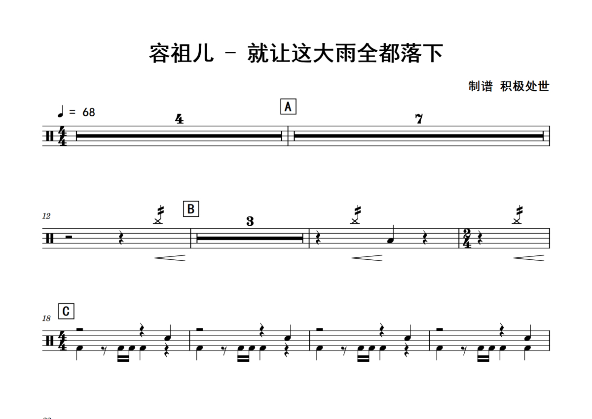 《就让这大雨全都落下》是容祖儿演唱的一首歌曲,拍号为4/4拍,歌曲速度为每分钟68拍,这份鼓谱共有两张高清图谱,图谱由 @老虎不说谎 编配上传,图谱使用五线谱编配,使用这份就让这大雨全都落下架子鼓谱,你将能够轻松地敲打出这首容祖儿的就让这大雨全都落下,快来尝试吧。