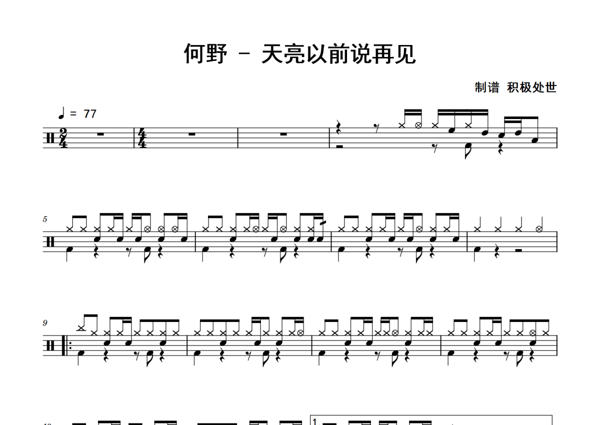 何野《天亮以前说再见》鼓谱 - 架子鼓谱