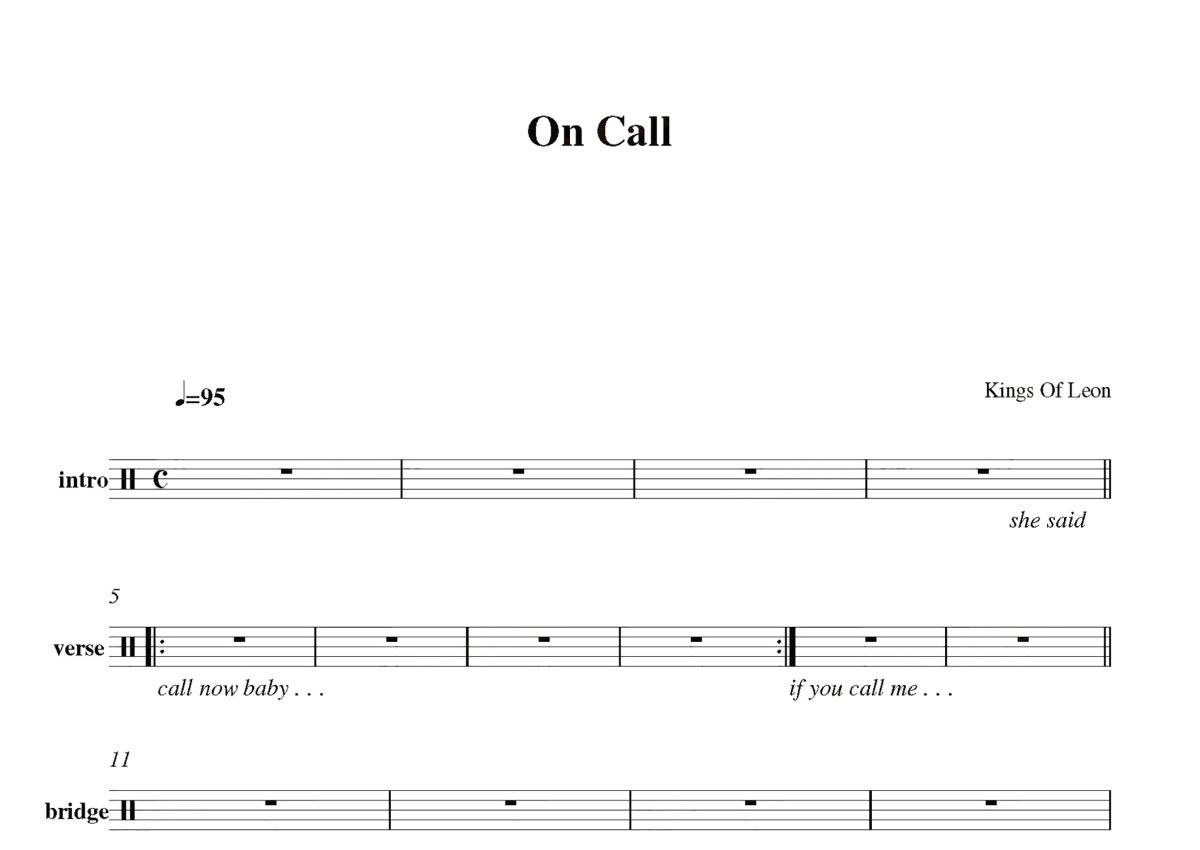 《on call》是kings of leon演唱的一首歌曲,这份鼓谱共有两张高清图谱,图谱由 @打鼓谱 编配上传,图谱使用五线谱编配,使用这份on call架子鼓谱,你将能够轻松地敲打出这首kings of leon的on call,快来尝试吧。“ On Call ”是美国摇滚乐队国王莱昂(Kings of Leon)的一首歌,作为他们2007年专辑“因为时代”中的第三首发行。这首歌还于2006年3月26日在英国作为该专辑的第一首单曲发行。在B面伴奏的“我的第三宫”的陪伴下,该单曲在英国单曲榜上排名第18位,并在爱尔兰和新西兰排名前30位。在澳大利亚,这首歌在2007年的Triple J Hottest 100 2007中排名第三。[1]。