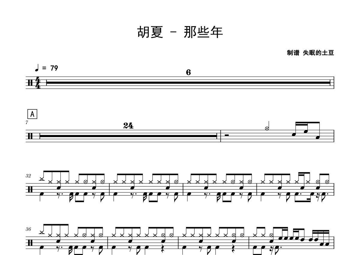 《那些年》是胡夏演唱的一首歌曲,拍号为4/4拍,歌曲速度为每分钟79拍,这份鼓谱共有三张高清图谱,图谱由 @老虎不说谎 编配上传,图谱使用五线谱编配,使用这份那些年架子鼓谱,你将能够轻松地敲打出这首胡夏的那些年,快来尝试吧。