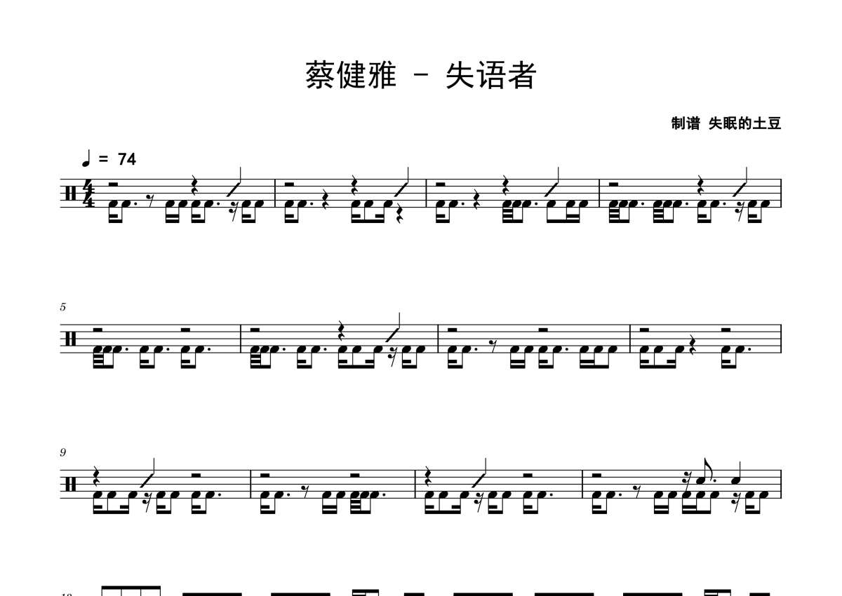 《失语者》是蔡健雅演唱的一首歌曲,拍号为4/4拍,歌曲速度为每分钟74拍,这份鼓谱共有两张高清图谱,图谱由 @老虎不说谎 编配上传,图谱使用五线谱编配,使用这份失语者架子鼓谱,你将能够轻松地敲打出这首蔡健雅的失语者,快来尝试吧。