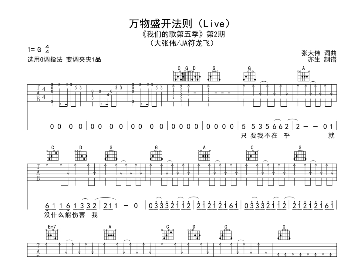 大张伟《万物盛开法则》吉他谱 - G调弹唱六线谱 - live