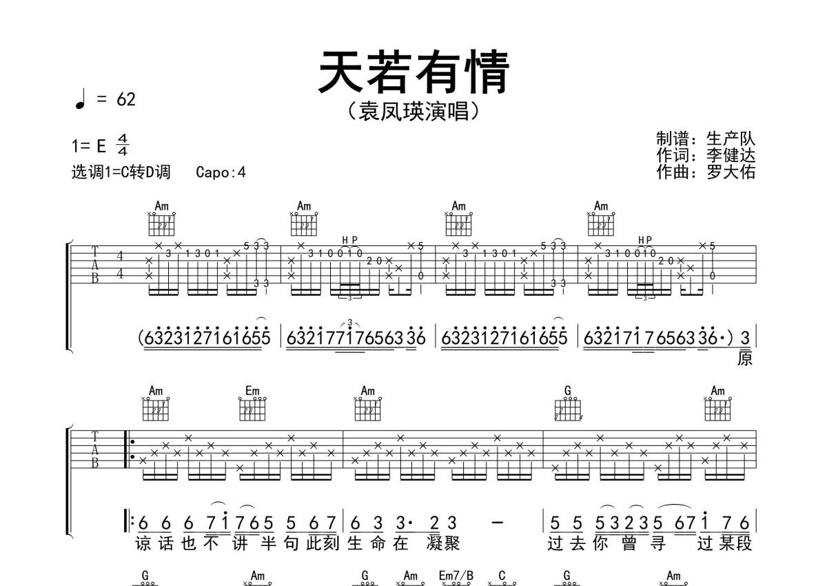 《天若有情》是袁凤瑛演唱的一首歌曲,精编完美版,拍号为4/4拍,歌曲速度为每分钟62拍,歌曲原调为E调,但由于原调指法比较难,为了方便弹奏,本吉他谱采用的是C调指法编配,变调夹4品弹奏即为原调,当然也可以根据自己的音域改变变调夹位置,或者通过改变和弦调性,以方便自己弹奏,这份吉他谱共有三张高清图谱,图谱由 @生产队 编配上传,图谱使用六线谱编配,包含吉他和弦指法、简谱以及歌词部分,使用这份天若有情吉他谱,可以让你更加方便地掌握这首歌曲的弹唱技巧,快来尝试吧。《天若有情》是香港流行歌手袁凤瑛演唱的一首粤语歌曲,由罗大佑作曲编曲,李健达填词,本曲也是电影《天若有情》的同名主题曲。本吉他谱根据原版采用C转D调指法编配,精准的前奏、间奏、尾奏和SOLO编配,值得推荐的经典怀旧歌曲!。