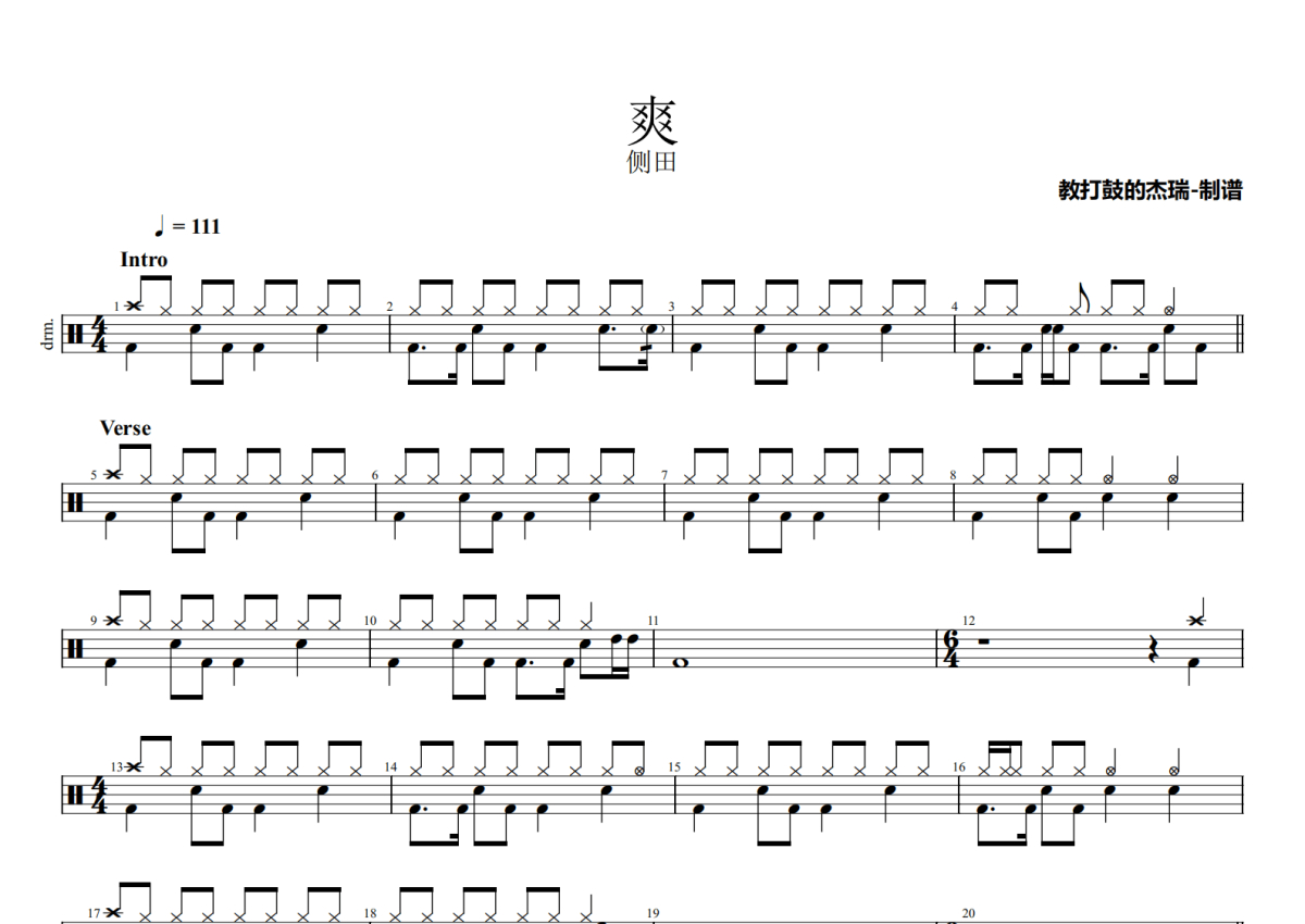 《爽》是侧田演唱的一首歌曲,拍号为4/4拍,歌曲速度为每分钟111拍,这份鼓谱共有三张高清图谱,图谱由 @Jerry 编配上传,图谱使用五线谱编配,使用这份爽架子鼓谱,你将能够轻松地敲打出这首侧田的爽,快来尝试吧。